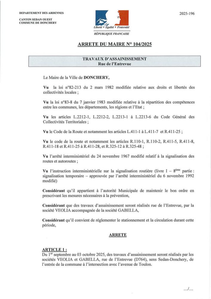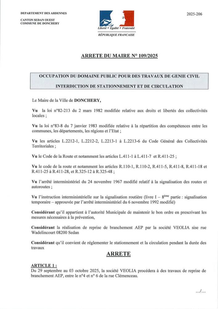 Retrouvez en cliquant ici l'arrêté municipal rédigé pour des travaux de reprise de branchement rue Clemenceau/Aristide Briand