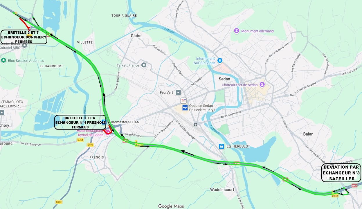 La circulation habituellement sur ce sens sera donc basculée sur le sens Sedan/Charleville ce qui entrainera la fermeture des bretelles des échangeurs de Donchery et Sedan (frenois) dans le sens Charleville /Sedan