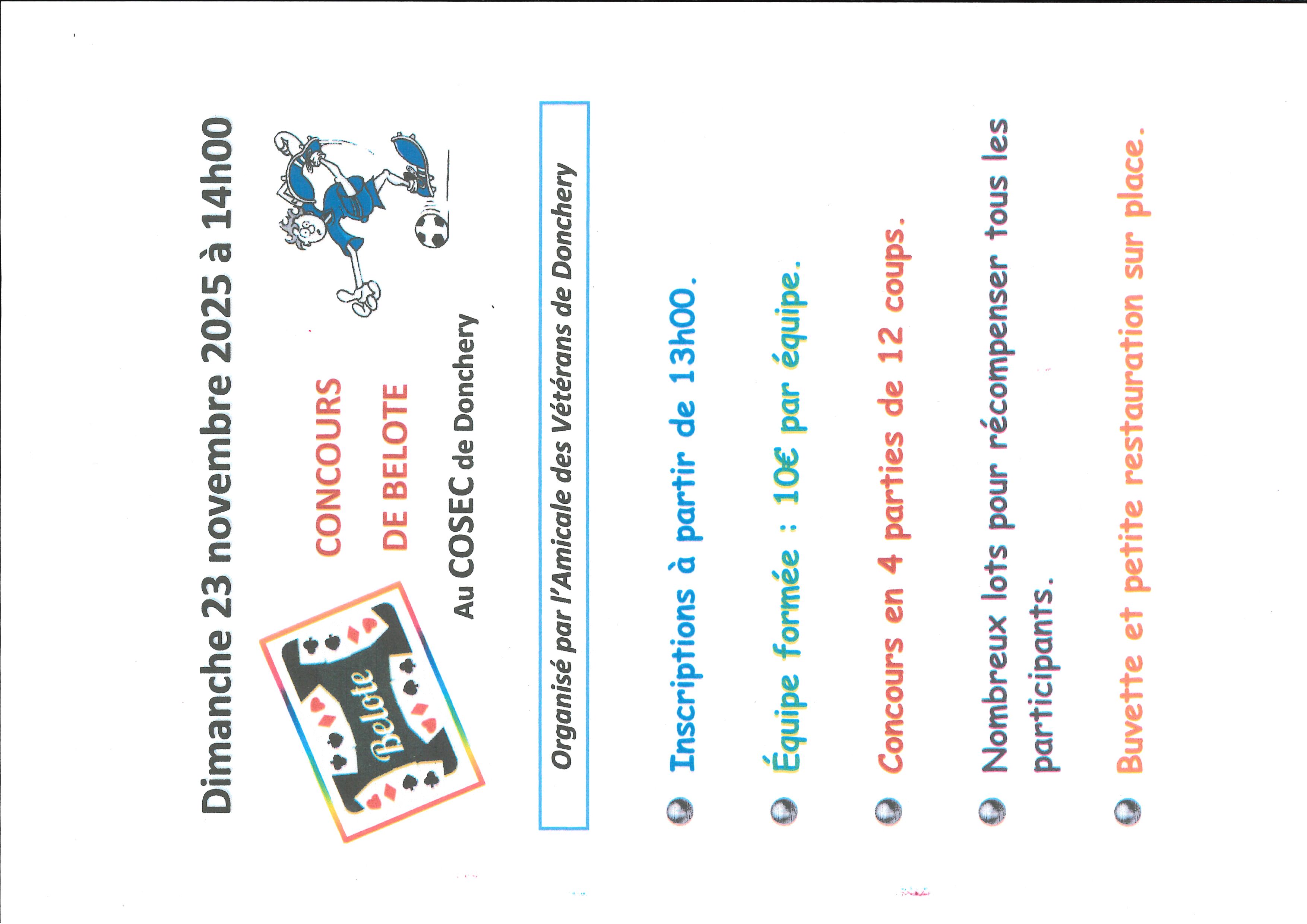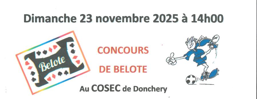 L'amicale des vétérans de Donchery vous invite à un tournoi de belote le dimanche 23 novembre 2025 au Cosec de Donchery, à partir de 14 heures.