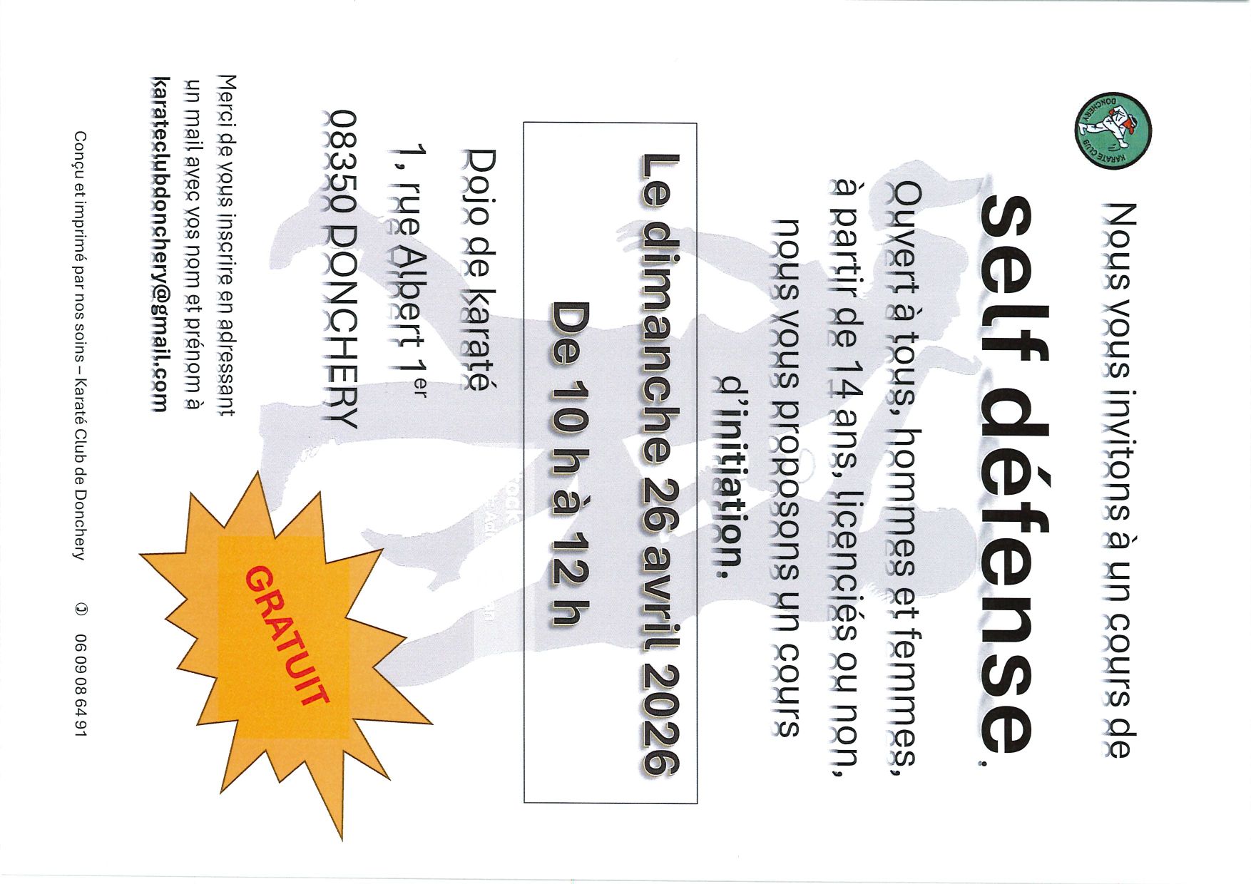 L'association Karaté Club de Donchery vous invite à une initiation de self défense. Pour tout renseignement, cliquez ici